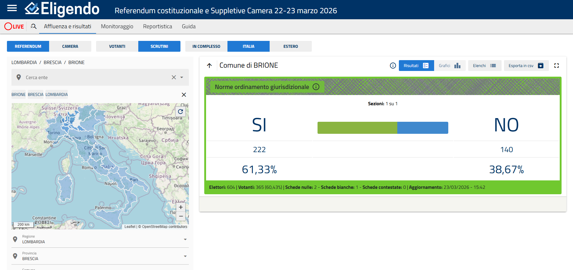 Descrizione I risultati relativi al referendum del 22 e 23 marzo 2026 sono consultabili al seguente link:https://elezioni.interno.gov.it/risultati/20260322/referendum/scrutini/italia/01030150270